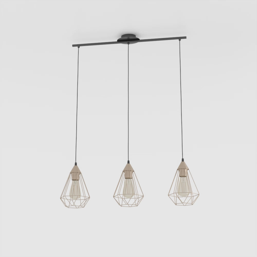 Cu cele trei abajururi tip "cușcă" din oțel, vopsite într-un finisaj cald de cupru și susținute de o bară metalică neagră, lustra TARBES aduce un plus de dinamism vizual. Designul aerisit permite evidențierea becurilor decorative, oferind o lumină caldă și ambianță plăcută în orice încăpere.