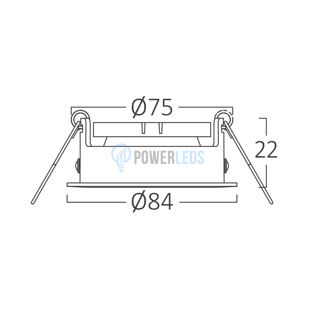 - Dimensiuni Compacte: Spotul are un diametru de 84 mm si o inaltime de 22 mm, fiind suficient de compact pentru a se potrivi in diverse spatii fara a atrage prea multa atentie. Designul permite o instalare ușoară într-un decupaj de 70 mm.